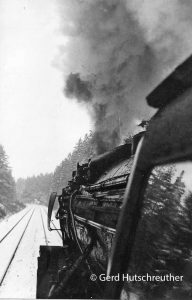 Na ja, do fohrder hald amoll mit. Ich kenn euch ja“, meinte er, machte aber keine Anstalten, uns jetzt schon in die Lok zu lassen. Deshalb stiegen wir wieder in den Zug, kauften beim Schaffner eine, besser gesagt zwei Fahrkarten und fuhren erst einmal bis Neuenmarkt. Dort machten wir die zweite „Attacke“ und hatten Erfolg. Wenig später stand Hans mit „abfahrbereitem“ Tonband, ich mit schussbereiter Kamera auf der 001 202-1 und warteten auf den Pfiff des Lokführers. Als es soweit war, erlebten wir eine Fahrt, die uns wieder einmal bewies, dass die 001 noch lange nicht zum alten Eisen gehört, obgleich seltsamerweise immer wieder Lokführer auf die 202 schimpfen. In neun Minuten schaffte sie die für fünfzehn Minuten Fahrzeit vorgesehene acht Kilometer lange „Schiefe Ebene“.
