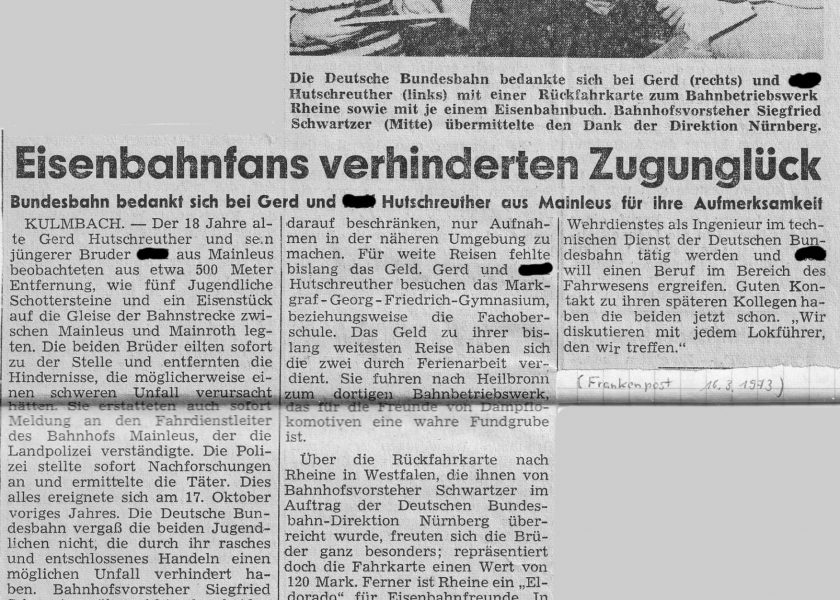 Unser 2-jähriges Jubiläum verlief , ebenso wie das einjährige, sang und klanglos. Dafür erhielten wir am 06.05.1970 von einem jungen Eisenbahner einen „heißen Tipp“. In Neuenmarkt, behauptete er, stünde eine S 3/6 (wussten wir ja längst) und eine 45er! Das weckte unsere Neugierde und schon am nächsten Tag wollten Hans und ich der Sache auf den Grund gehen: